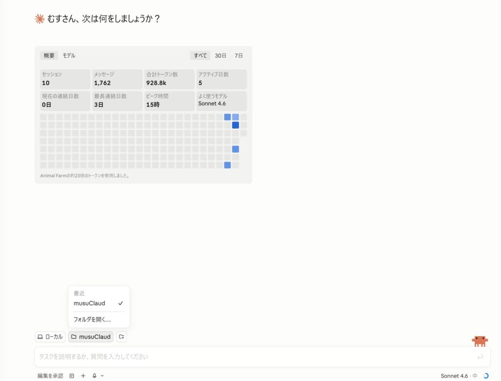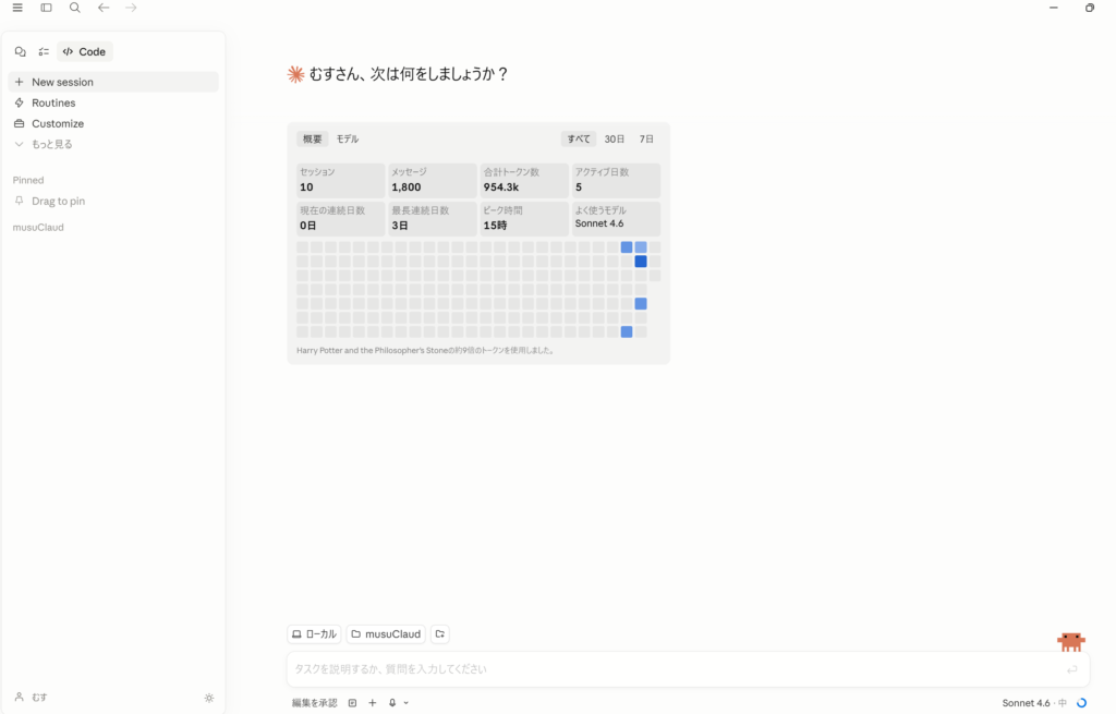 ▲ Claude Codeのホーム画面。右下のオレンジの生き物がクロです。「むすさん、次は何をしましょうか?」と毎回迎えてくれます。