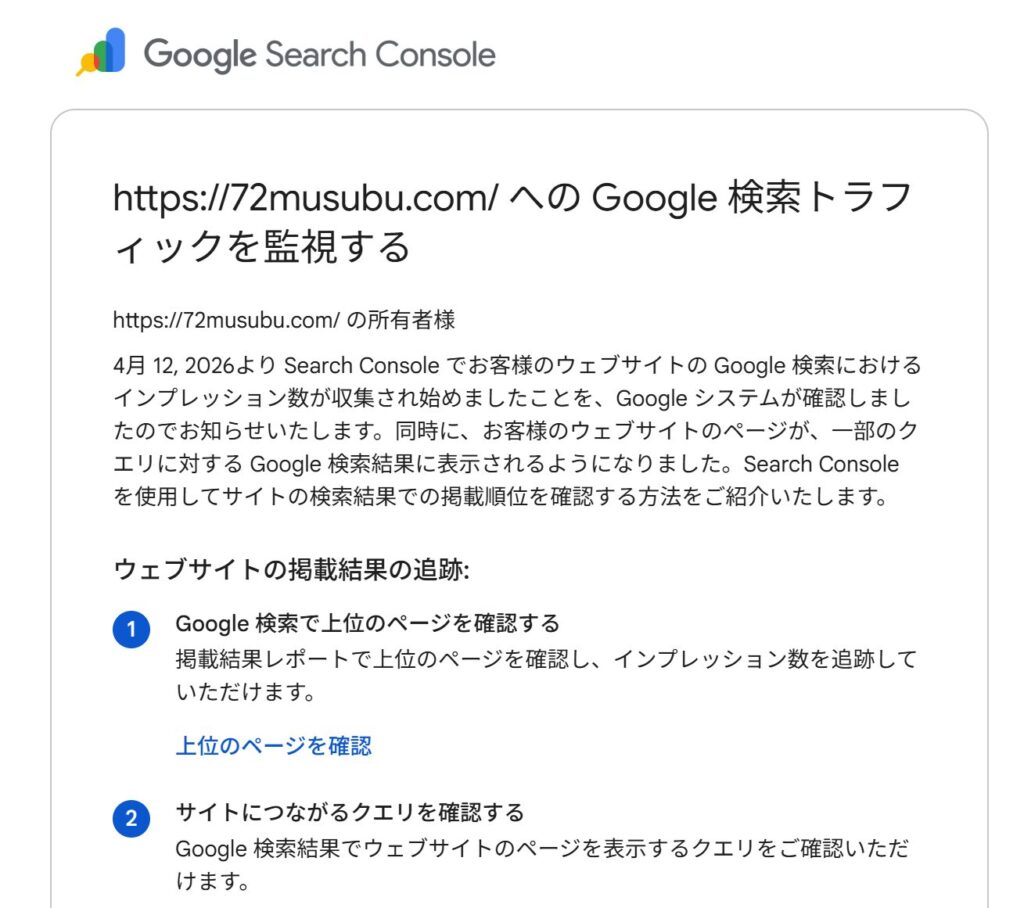 これ、実はGoogleの検索に自分のブログが載り始めたというお知らせでした。
