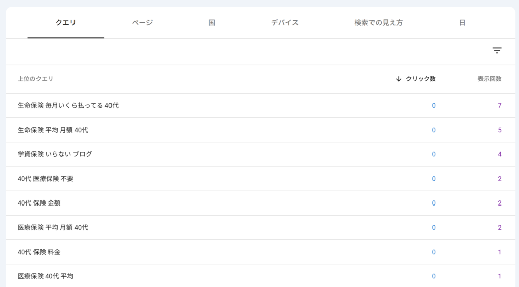 どんなキーワードで検索されているかを定期的にチェックする。上の表を見ると、保険系キーワードで表示され始めているので、この方向の記事を充実させることが有効だとわかります。