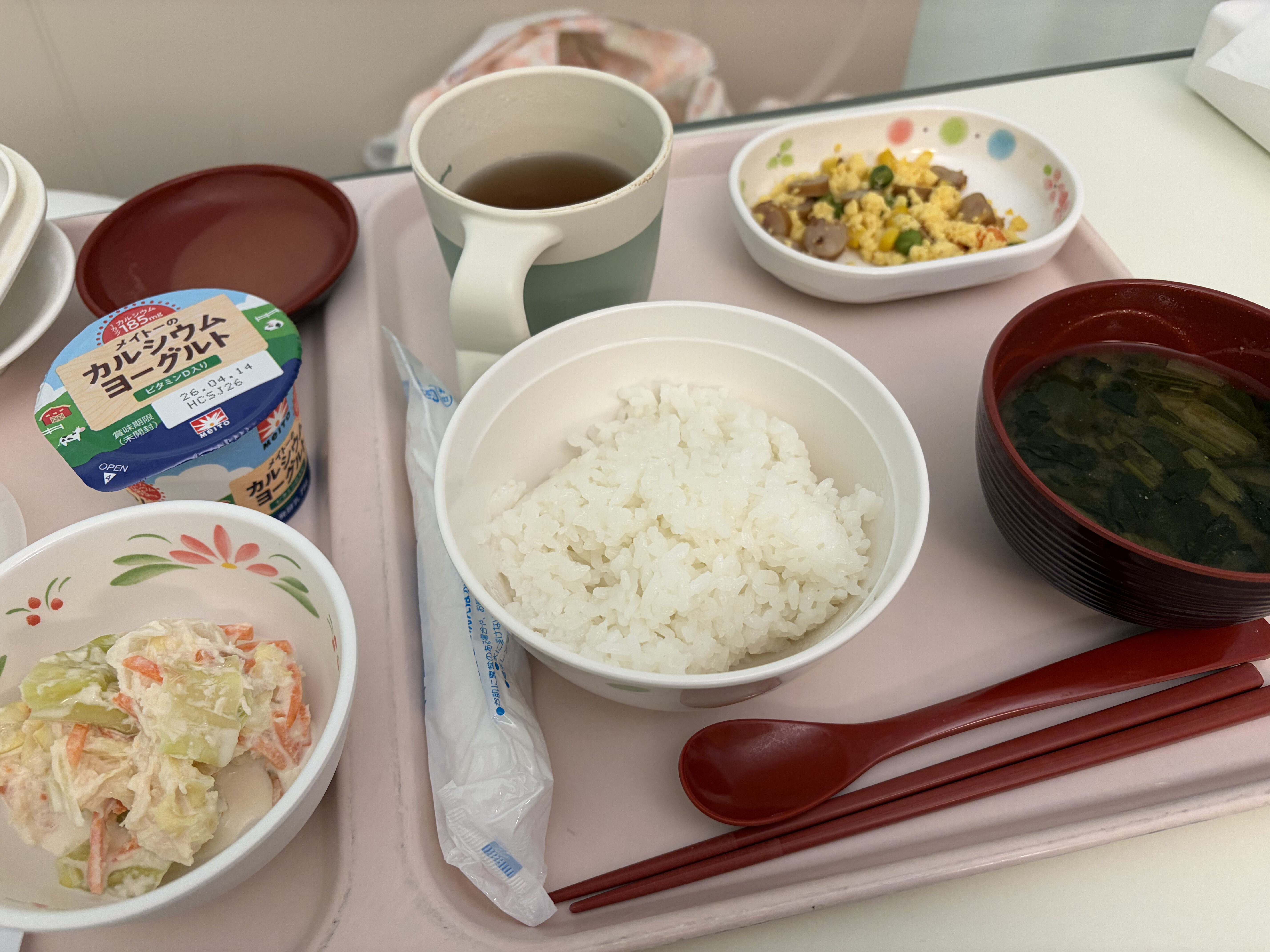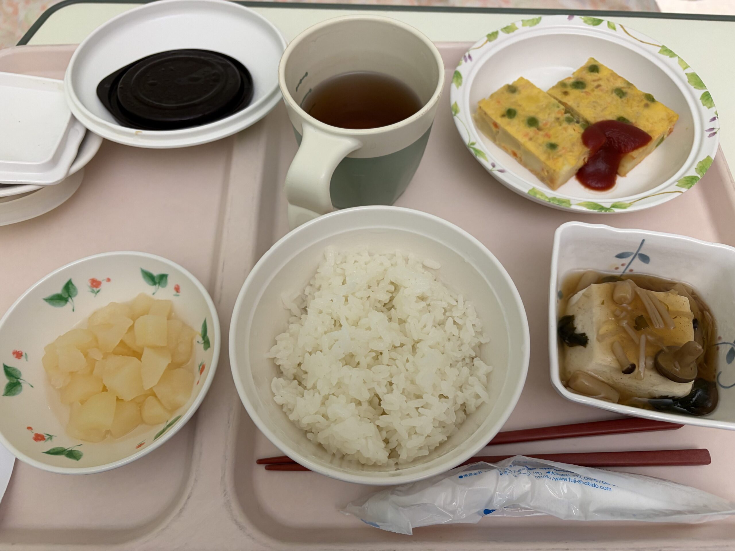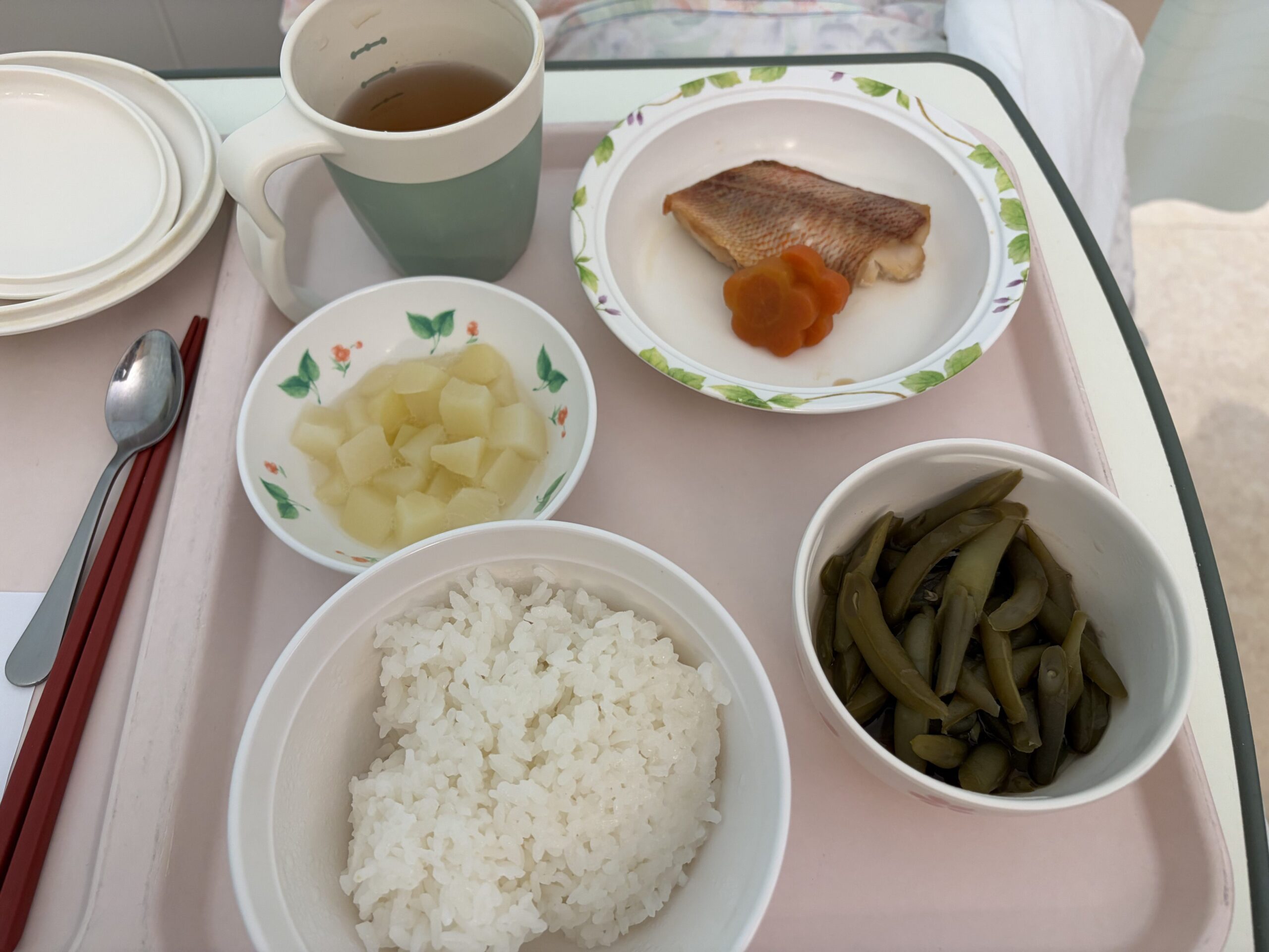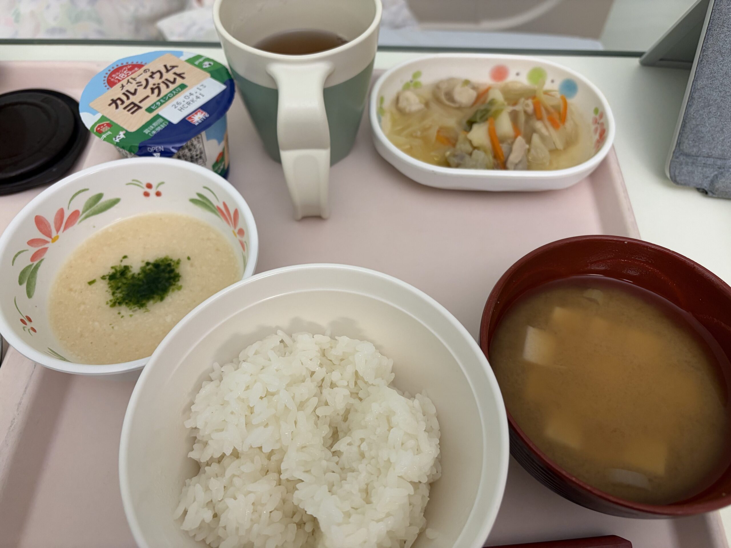 7:35 朝食 米飯180g、味噌汁、鶏肉の野菜スープ煮、とろろ、ヨーグルト。足らん。 思わず「おかわりできますか」と聞いてしまった。すると栄養士さんが笑いながら、「おかわりはできないけど量が増やせるか先生に聞いてみます」と答えてくれた。