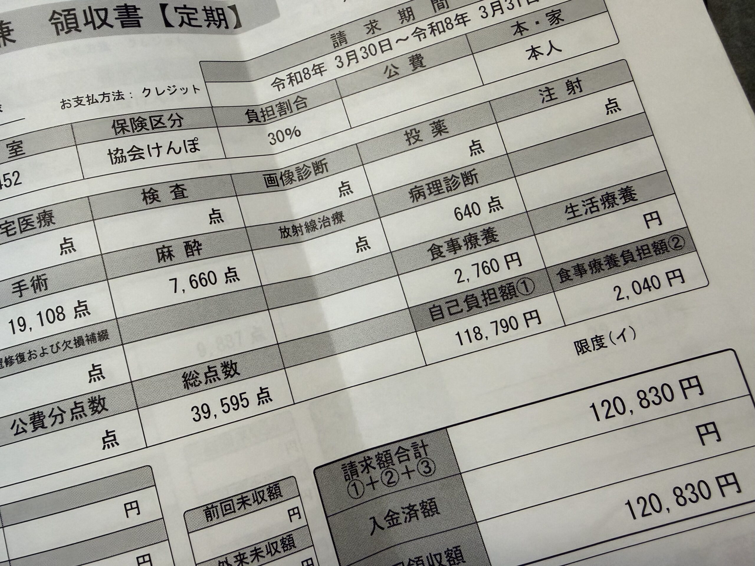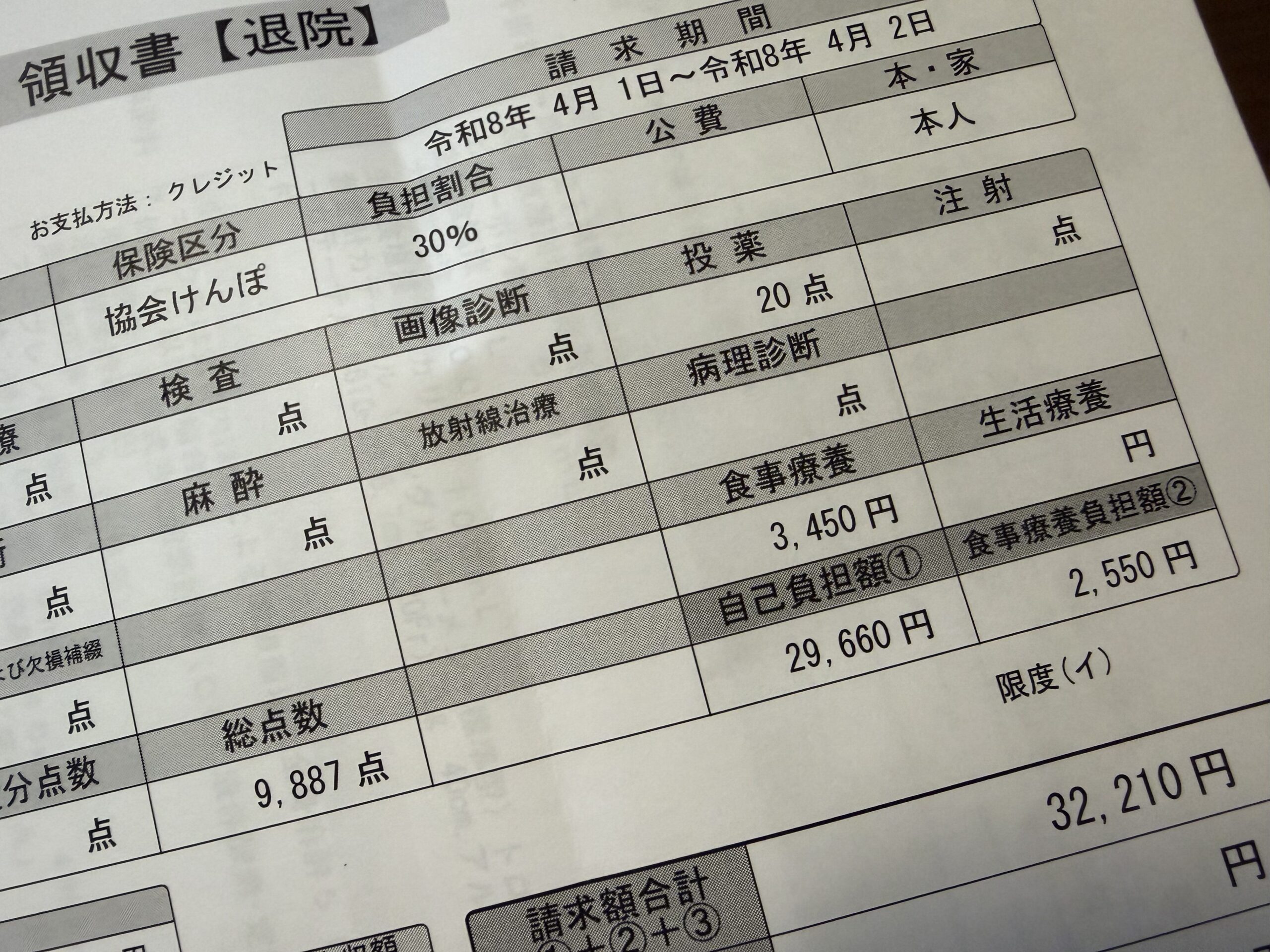 ちなみに領収書に「この領収証は高額療養費の請求や医療費控除に必要です」と書いてあった。高額療養費制度を使えば上限額を超えた分が後から戻ってくる可能性があるので、退院後に確認する予定だ。