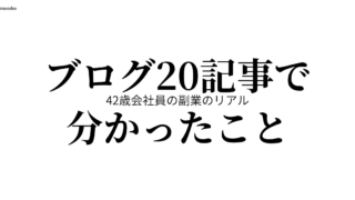 副業 ブログ20記事書いて分かったこと|42歳会社員のリアル ブログ20記事書いた42歳会社員のリアル体験。時間確保・ネタ切れ・読まれない問題など実際に感じた課題と、続けるためのコツを解説。これからブログを始める人にも役立つ内容です。 2026.03.23 副業